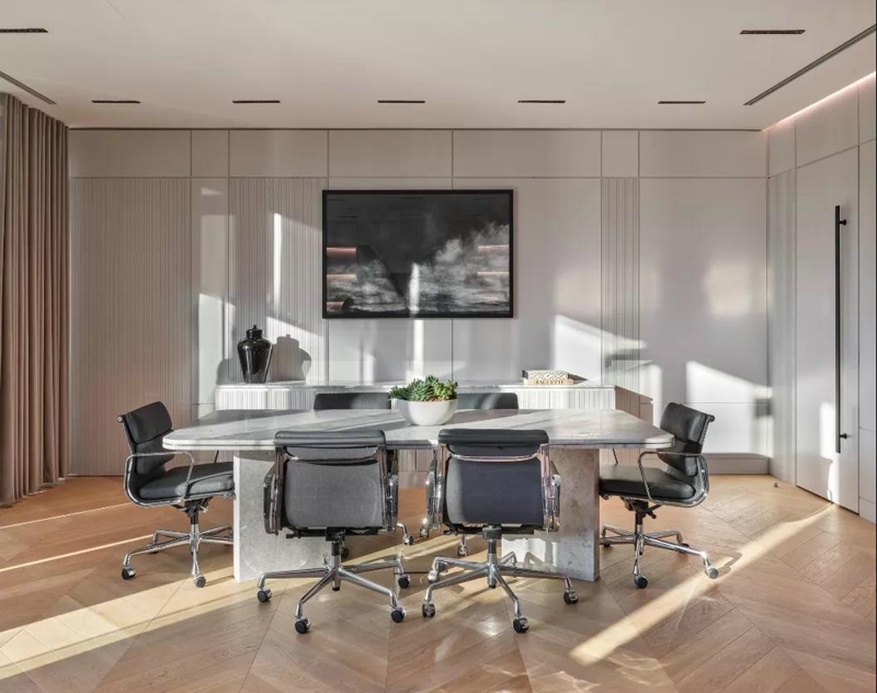 二、通高的雙面板材隔斷系統(tǒng) ▶雙面板材的辦公室通高隔斷系統(tǒng) ◎根據(jù)辦公場景的不同,比如石膏板乳膠漆、石膏板藝術(shù)涂料、木飾面板、皮革布藝硬包、成品板等等都可以。 1、石膏板乳膠漆。一些日常通勤的空間,采用鋼骨架與石膏板乳膠漆隔斷,也是辦公場景中最常見的一種做法,比較簡潔與經(jīng)濟。