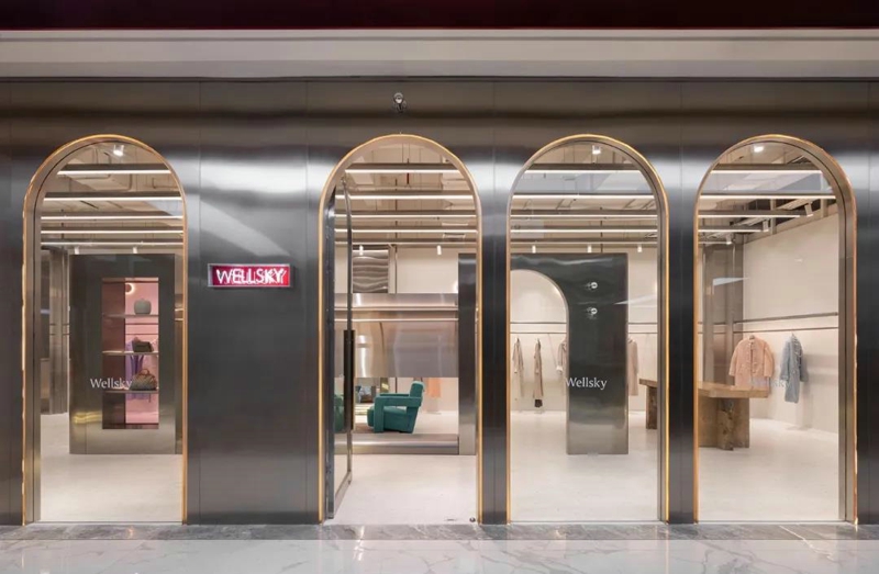 (4)門頭外觀設(shè)計。門頭的外觀在設(shè)計上要與周圍環(huán)境以及品牌調(diào)性和品類相協(xié)調(diào)。門頭外觀展現(xiàn)服裝店的檔次和個性,常用的有兩種風(fēng)格分別是現(xiàn)代風(fēng)和傳統(tǒng)風(fēng),通常商場里的服裝店門頭都是以現(xiàn)代風(fēng)為主。在設(shè)計上要與周邊的環(huán)境互相協(xié)調(diào)融合,門頭外觀的整體風(fēng)格要依據(jù)甲方品牌的調(diào)性和品類來決定,如果是比較有地域特色的服飾可以采用傳統(tǒng)風(fēng)格。